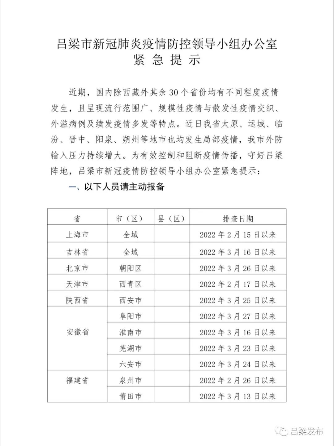 * 查詢呂梁市各區(qū)域的疫情風險等級。